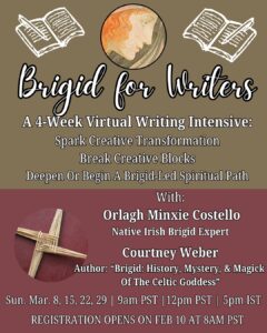 Are you drawn to the Irish Brigid and/or Irish spirituality in general? Are you a writer looking to deepen your creative abilities, spark creative transformation, break through creative blocks, and expand your writing by utilizing the myth and Magick of Brigid? Are you interested in deepening or beginning a Brigid-led spiritual practice?