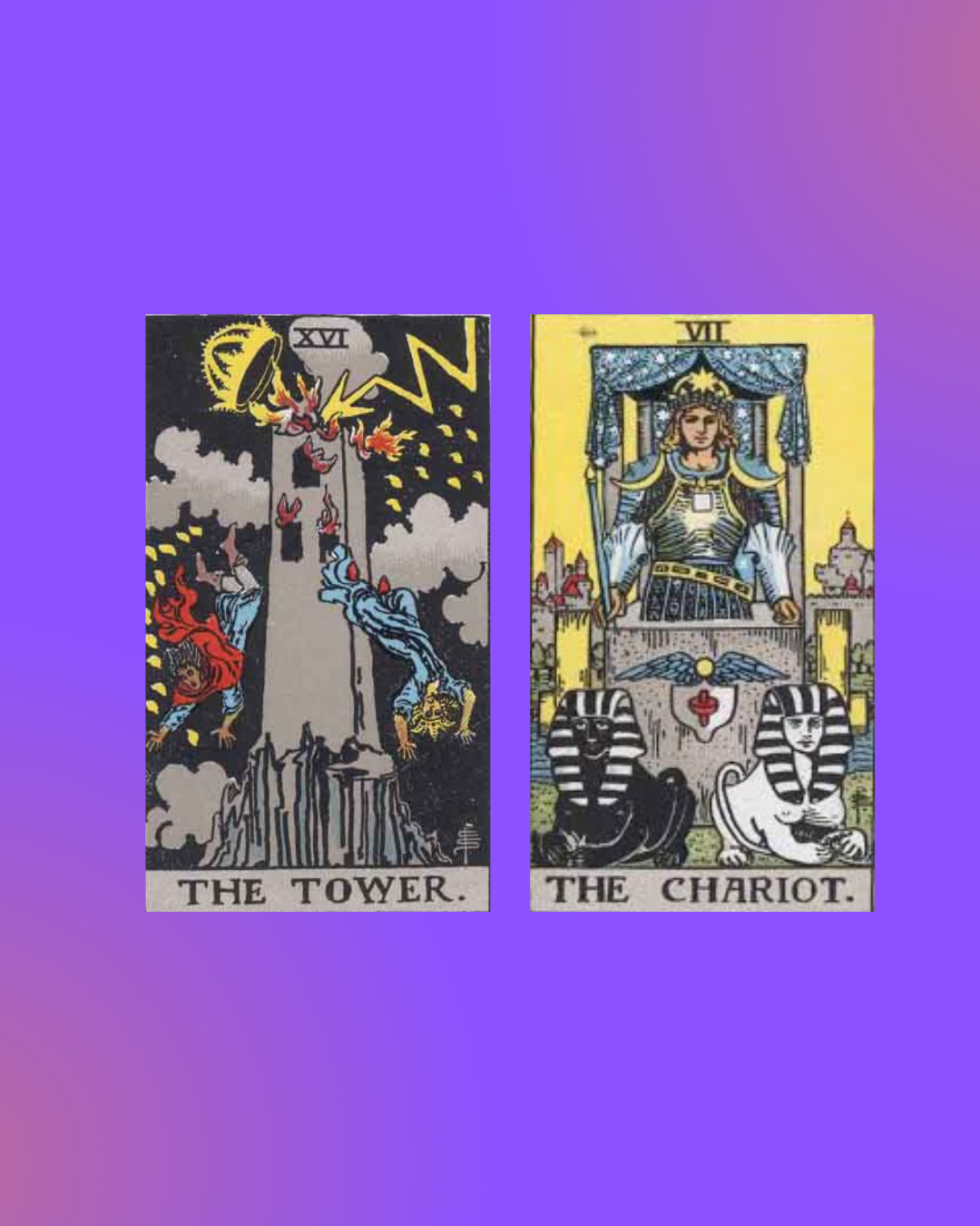 The Tower: Upheaval, collapse. The Chariot: Forward movement.