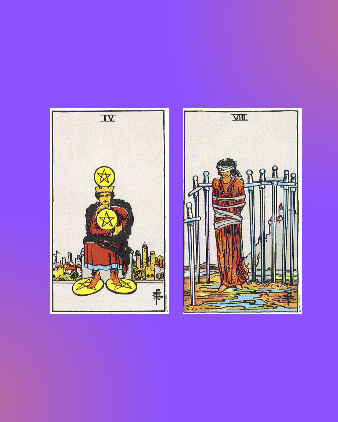 4 of Pentacles: Holding on for dear life. 8 of Swords: Bound up and restrained.